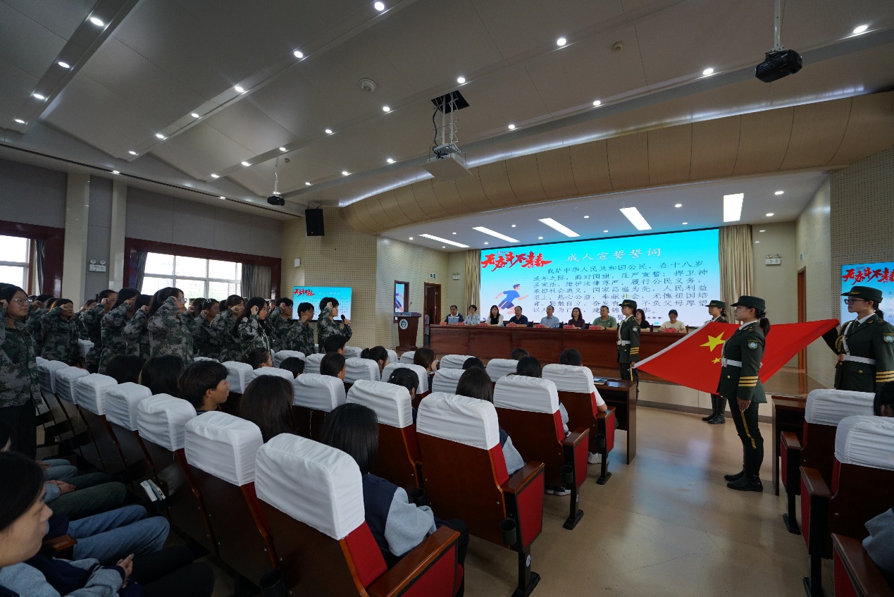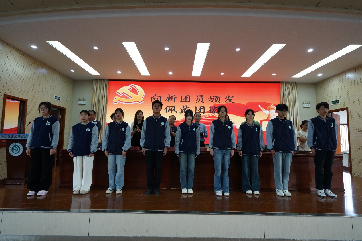 儀式在莊嚴的國歌聲中拉開了序幕。學院團委書記李斐斐宣讀了新團員名單并給予了真摯的祝福。參會領導為新團員代表佩戴團徽,新團員進行了入團宣誓,十八歲學生進行了成人宣誓。