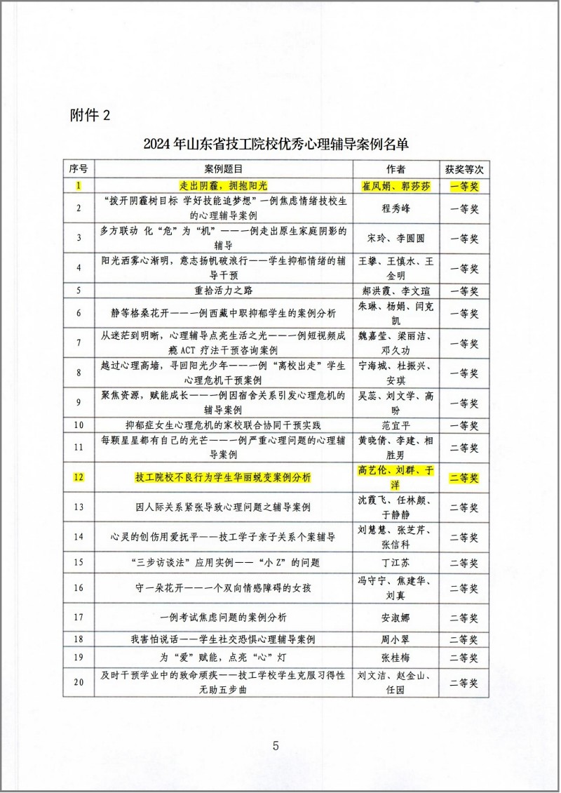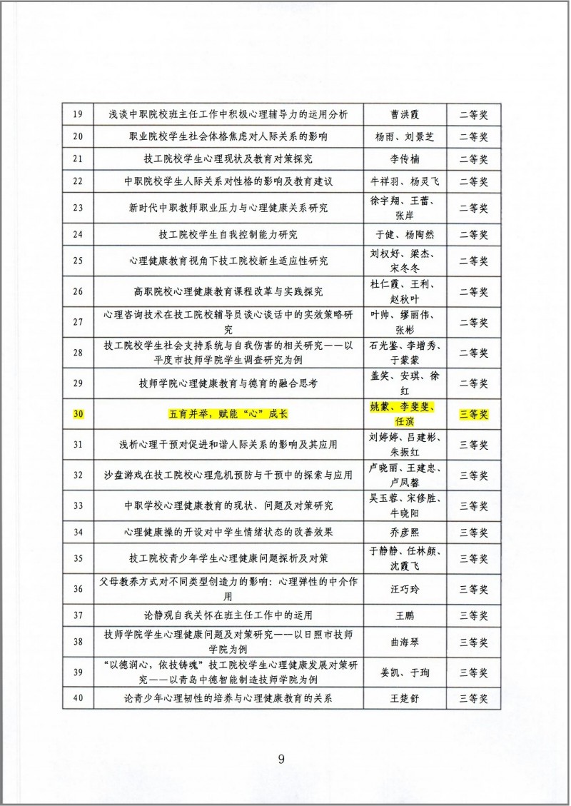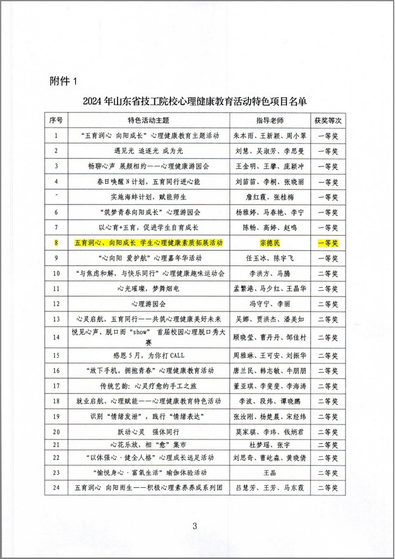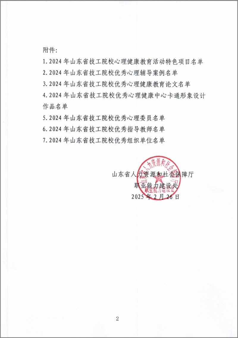 近日,山東省人力資源和社會保障廳公布了2024年山東省技工院校心理健康教育主題活動評選結(jié)果。我院被評為“2024年山東省技工院校心理健康教育主題活動優(yōu)秀組織單位”。我院共推送項目8項,獲評特色活動一等獎1項,心理輔導(dǎo)案例一等獎1項、二等獎1項,論文三等獎1項,優(yōu)秀心理委員2名,優(yōu)秀指導(dǎo)教師1名。