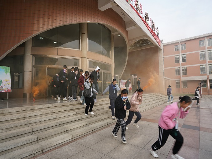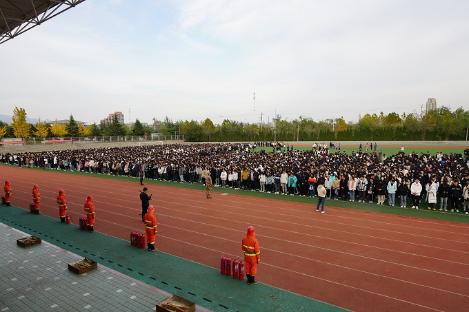 下午3點40分,警報突響,疏散演練活動正式開始。教學樓發生不明真相的火災,隨著火警報警聲響起,按照學院消防疏散演練方案要求,立即啟動安全緊急預案,組織緊急疏散。學生們彎腰低姿、濕巾捂口,在教師、教官的指引下按照疏散路線安全有序地撤離至體育場。
