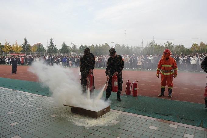 疏散師生集結完畢,學生代表在學院消防員的講解下進行了滅火器的實際操作,提高了學生對消防器材的使用能力,掌握了滅火器的使用要領,更好的積累了滅火實戰經驗。