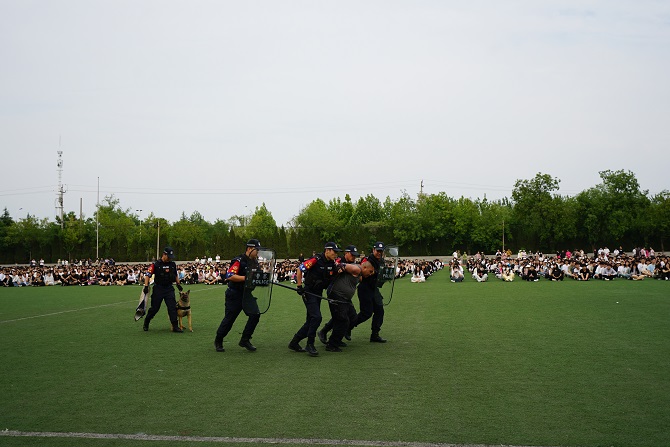 第二階段是反恐演練,由學工部、保衛處、安保人員和獵豹突擊隊組織師生進行演練。