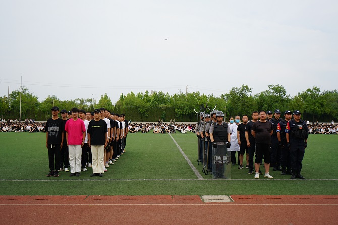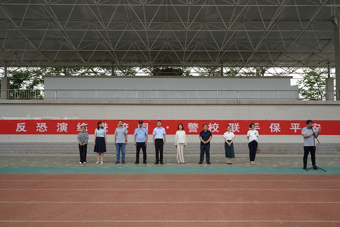 在演練現場,一名“歹徒”在足球場欲對學生進行砍殺,老師、安保人員、民警迅速抵達現場,經過一番激烈搏斗后,警民同心同力將“歹徒”制服,解救出學生,確保了學校師生的人身安全,提高了師生的應急響應速度和應對突發事件的能力。