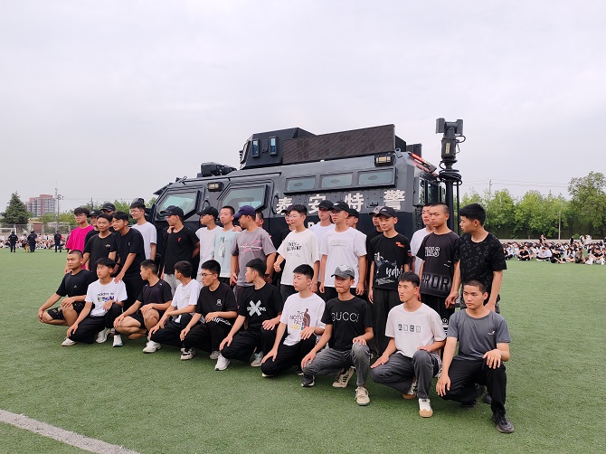 演練結束后,師生近距離接觸、體驗防暴裝甲車等新型警用裝備,觀看警犬訓練成果并與警犬互動合影留念。