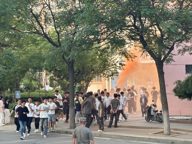 6點30分,疏散逃生演練正式開始。宿舍樓發生不明真相的火災,濃煙迅速向樓道蔓延,值班人員發現后迅速報告。火警報警聲在校園上空響起,學院立即啟動安全緊急預案,發播緊急求援疏散命令,并撥打119報警,同時向上級部門報告情況。學生們彎腰低姿、濕巾捂口,在教師、教官的指引下按照疏散路線安全有序地撤離至體育場。整個疏散過程緊張而有序,師生們積極參與,達到了預期效果。