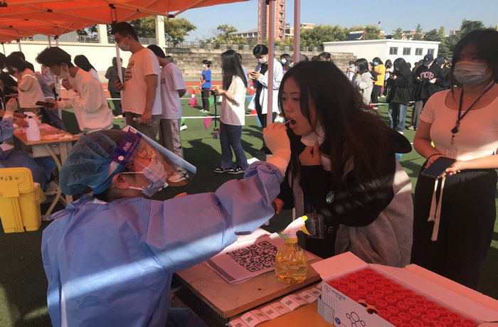 檢測(cè)現(xiàn)場(chǎng)共設(shè)10組檢測(cè)臺(tái),教職工及第三方一組,學(xué)生9組,按食品系、健康系、制藥工程學(xué)院、藥品商貿(mào)學(xué)院、升學(xué)部、中藥學(xué)院順序檢測(cè)。師生有序分批排隊(duì)前往,有序排隊(duì)、即采即走、避免聚集,專(zhuān)業(yè)檢測(cè)人員核驗(yàn)身份、登記采樣,各項(xiàng)工作井然有序,整體流程操作規(guī)范、防護(hù)到位、安全嚴(yán)謹(jǐn)。