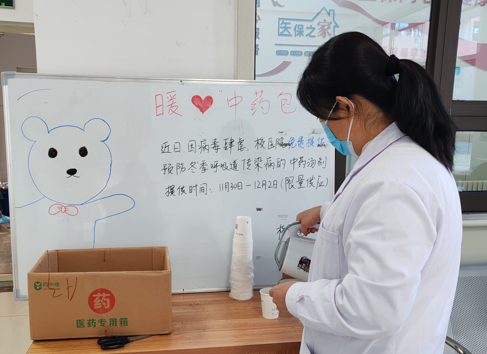 “同學(xué)來喝一碗中藥湯劑吧!”11月30日校醫(yī)院的門診大廳,后勤服務(wù)黨支部及校醫(yī)院工作人員正負(fù)責(zé)加熱、發(fā)放暖心中藥包。此次暖心中藥包全部免費(fèi)發(fā)放,活動時間3天。為保證藥效,校醫(yī)院的工作人員早在前一天晚上就將中藥浸泡,次日上午6時開始煎熬裝袋,9時左右供應(yīng)飲用。