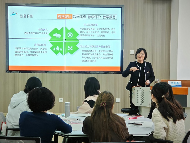 在接下來的兩天里,各領域專家,河南醫藥健康技師學院健康服務管理系副主任張亞麗、山東醫藥技師學院健康管理系專職教師馬承梅和北京家政服務協會會長王君分別對自己負責的模塊進行示范課設計與指導,并對大家的試講進行了詳細點評,讓學員們更加清晰地認識到康養領域的發展趨勢和未來方向。最后,各小組展示了各自優秀作品,圓滿完成了培訓。