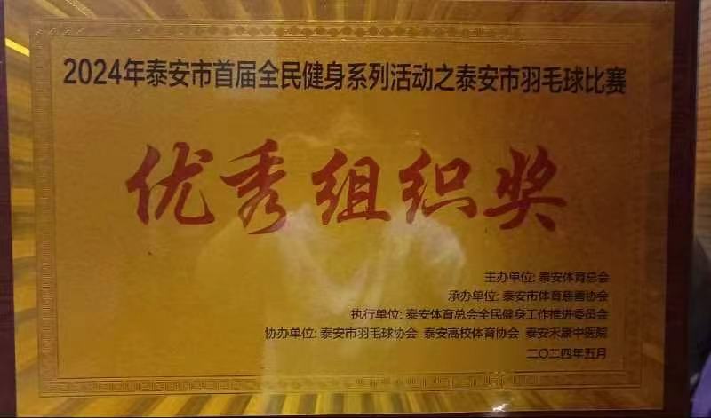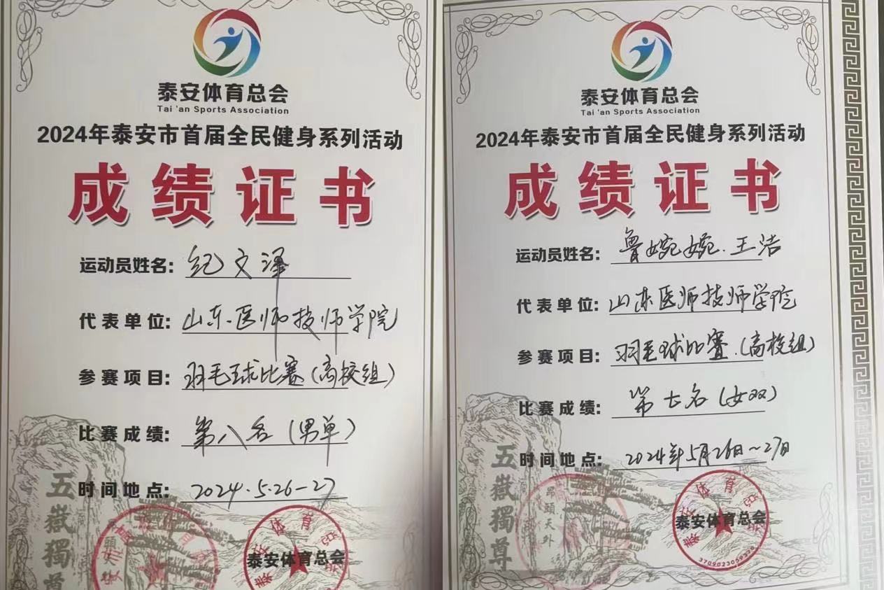 近日,“健身泰安 幸福萬家”2024年泰安市首屆全民健身系列活動之泰安市羽毛球比賽在泰安市全民健身中心開賽。學院黨委副書記陳世偉、工會主席翟樹林帶隊教師組,學工部副部長宗德民、基礎部教師杜金利帶隊學生組參賽。