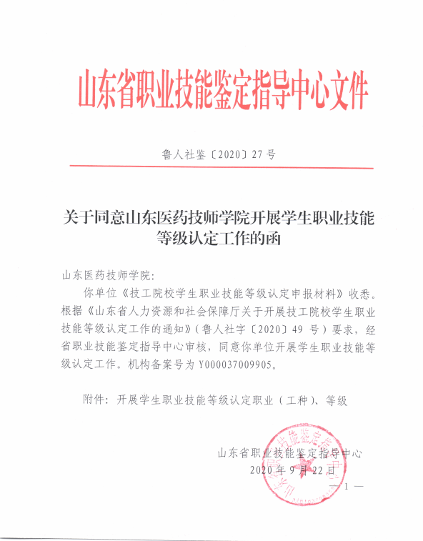 附件:關于同意山東醫藥技師學院開展學生職業技能等級認定工作的函
