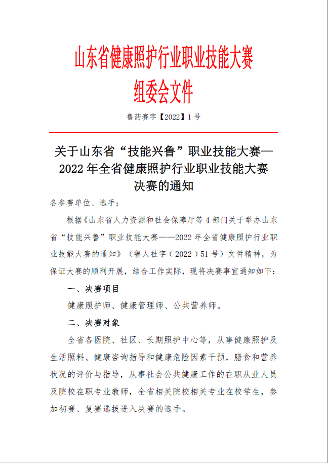 附件:關于山東省“技能興魯”職業技能大賽-2022年全省健康照護行業職業技能大賽決賽的通知