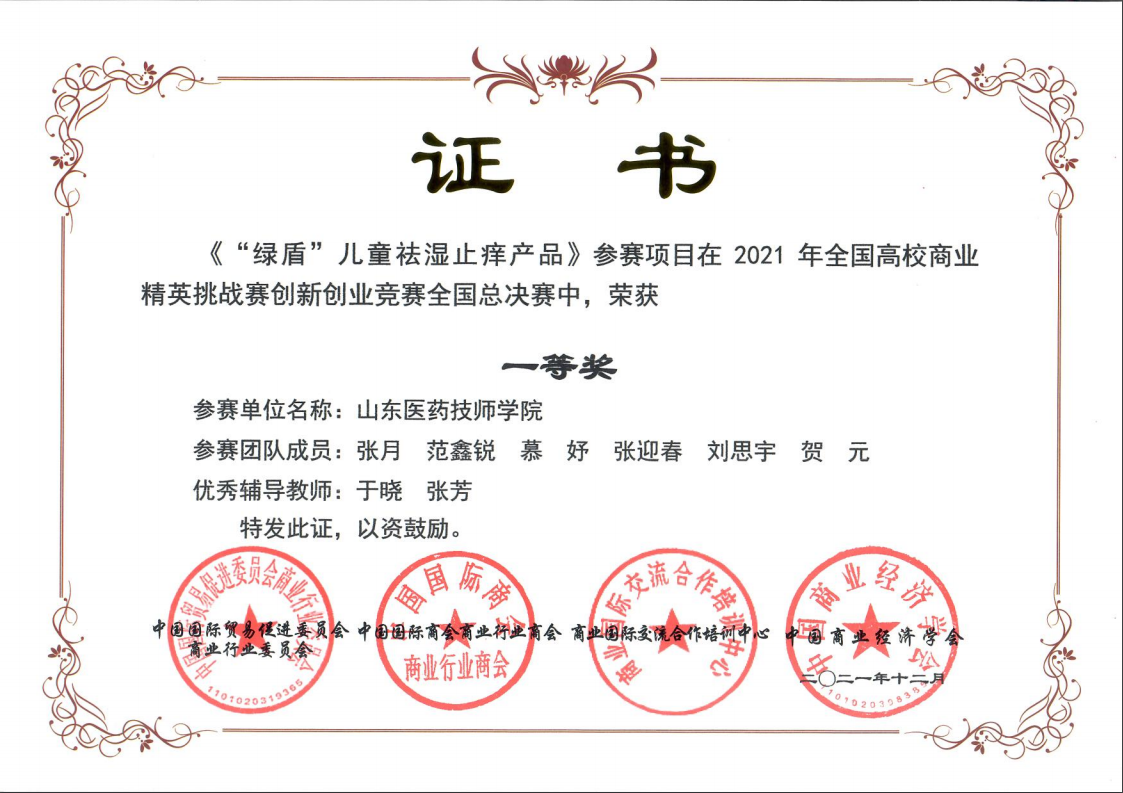 2021年大賽共吸引了來自全國300多所高等院校報名參賽,范圍覆蓋26個省、直轄市、自治區,最終447支參賽團隊,3500余位輔導教師和參賽選手參加全國總決賽。我院張月、范鑫銳、慕妤、張迎春、劉思宇、賀元六名學生,在于曉老師的指導下,憑參賽項目《“綠盾”兒童祛濕止癢產品》,以小組第一名的成績晉級精英賽,最終榮獲全國總決賽一等獎。