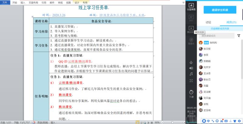 張利利老師以《國內外食品安全案例分析》為題進行了示范課。通過騰訊課堂、云班課、釘釘等平臺,面向全系教師在線示范教學。主講教師熟練運用在線課堂教學軟件的各種功能,開展了線上授課、線上討論、問卷調查、答疑輔導等多種形式的教學環節,給全系教師展現了生動有趣、形式多樣的線上教學方式。