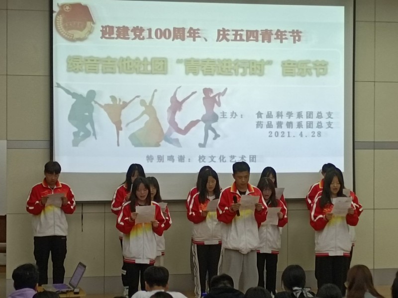 4月28日晚上,食品科學(xué)系綠音吉他社團聯(lián)合藥品營銷系團總支舉行“慶五四青年節(jié),迎建黨100周年”音樂節(jié)晚會,吉他社團的同學(xué)們激情獻唱,樂手歌手們充滿激情與夢想的聲音贏得到場觀眾齊聲喝彩。同時,音樂節(jié)現(xiàn)場穿插了各種形式的精彩節(jié)目:校文化藝術(shù)團選送的舞蹈節(jié)目《舞動青春》彰顯了同學(xué)們青春的氣息,點燃了整個晚會氛圍;食品科學(xué)系傳統(tǒng)武術(shù)興趣小組表演的《男兒當自強》迎來了陣陣掌聲,最后節(jié)目在學(xué)生會干部們的詩朗誦《釋放青春,追夢前行》中圓滿落下帷幕。