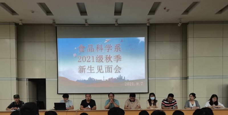 9月8日上午,食品科學系在信息樓二樓階梯教室召開2021級秋季新生見面會,食品科學系主任王育虎,副主任續飛、宗德民,團總支委員楊帆、翟帥,駐系教官紀錄和新生班主任出席見面會,見面會由系學管主任宗德民主持。