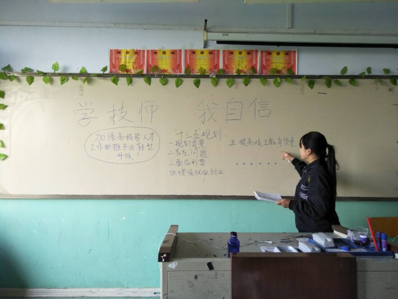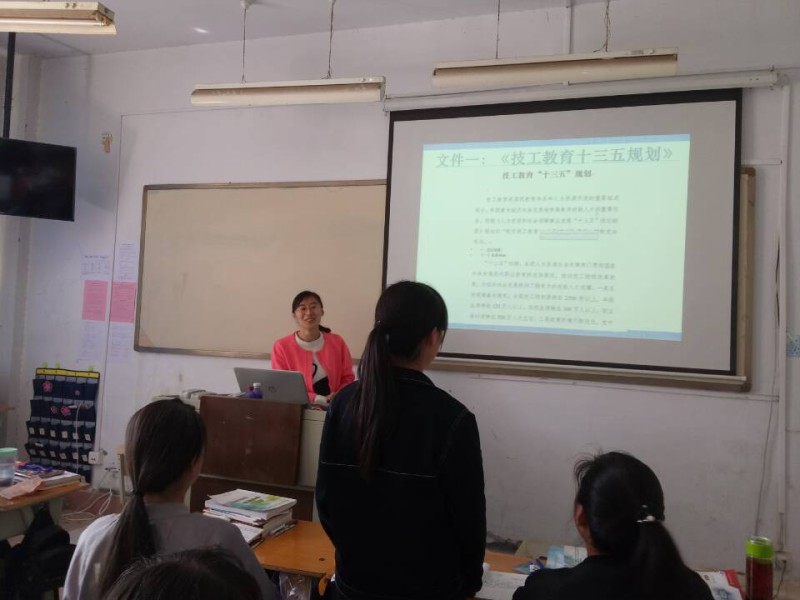 班會上,各位班主任向學生傳達人社部印發的《技工教育 “十三五”規劃》文件,詳細講解國家對技工教育的政策支持,通過PPT、視頻等多種形式,向大家講述學技能、讀技師的重要性,并結合我院優秀畢業生成長成才的真實案例給學生闡述樹良好品德、學一技之長的必要性。