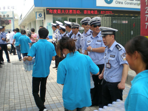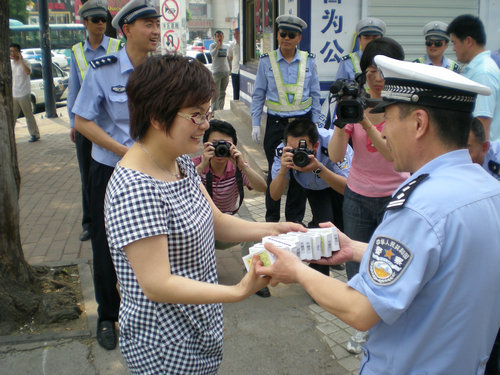 學生為交警贈送礦泉水
