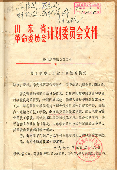 2、1978年1月6日,山東省商業局經請示山東省計劃委員會同意,進一步明確:“山東省泰安藥材技工學校招生分配、經費、基建由省負責,干部教職工由地(市)調配管理”,并委托泰安地區商業局代管。