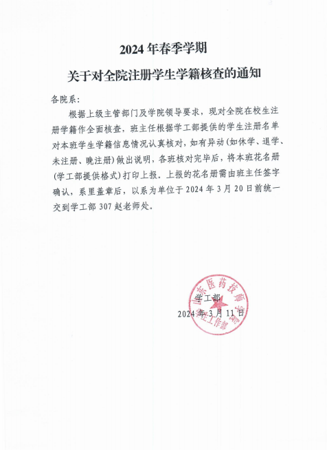 2024年春季學期關于對全院注冊學生學籍核查的通知