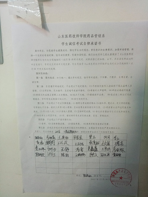 2017年12月17日,藥品營銷系即將迎來期末考試,為此開展誠信考試自律承諾書簽字活動。