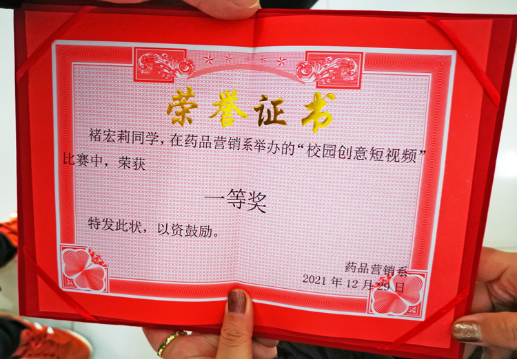 12月29日,藥品營銷系在學院H樓三樓進行了“校園創意短視頻”比賽頒獎活動。比賽于11月正式啟動,面向學院全體學生征集原創短視頻作品,吸引了全校同學的廣泛關注,期間共收到200余部學生投稿作品。經評委評選,共評出一等獎一人、二等獎二人、三等獎三人,有6部作品從中脫穎而出,獲得獎項。