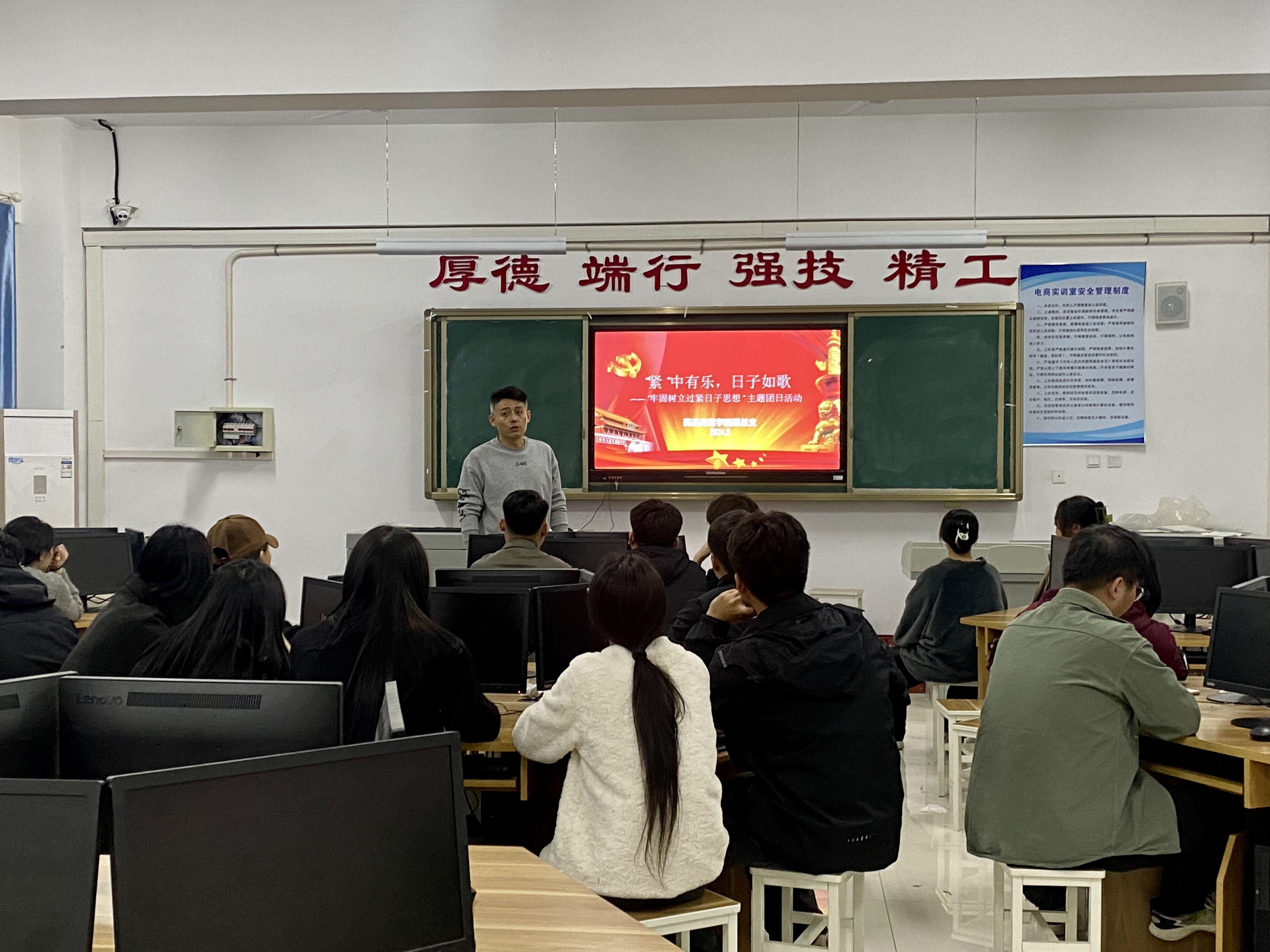 近日,團總支書記劉群在H305教室為同學們開展了以“緊中有樂,日子如歌”為主題的團課活動。本次團課中,劉群引經(jīng)據(jù)典,用生動有趣的案例和深入淺出的講解,讓同學們認識到節(jié)約的重要性。他強調(diào),作為新時代的青少年,應該時刻銘記節(jié)約是中華民族的傳統(tǒng)美德,引導學生懂得珍惜現(xiàn)在來之不易的生活。