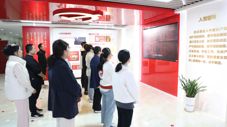 走進黨章教育廳,教師團員們借助多媒體技術詳細了解黨章的發展歷程與時代內涵,并集中觀看專題片《初心印記》,深入解讀黨章核心要義。隨后,三支部黨員面向黨旗莊嚴宣誓,重溫入黨初心。鏗鏘的入黨誓言不僅強化了黨員的身份意識與責任擔當,也讓在場的團員青年深受教育,對黨的向往和追求更加具體、更加深刻,激發了向黨組織靠攏的堅定決心。