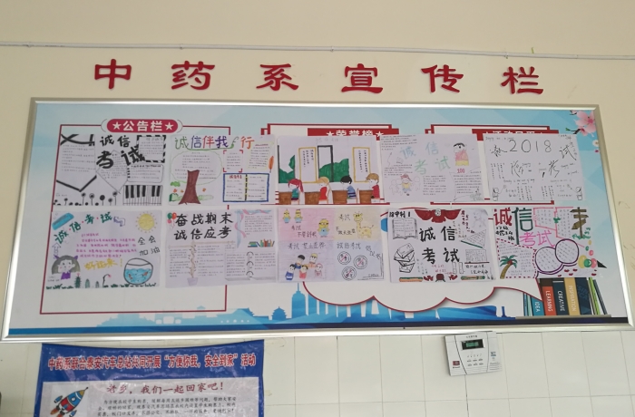 隨著期末考試的臨近,為營造良好的考試氛圍、凈化考場環境、杜絕有失誠信的舞弊行為,6月20日中藥系開展了有關 “誠信考試,從我做起”主題活動。主要包括誠信考試手抄報展示、橫幅、宣傳海報等活動。