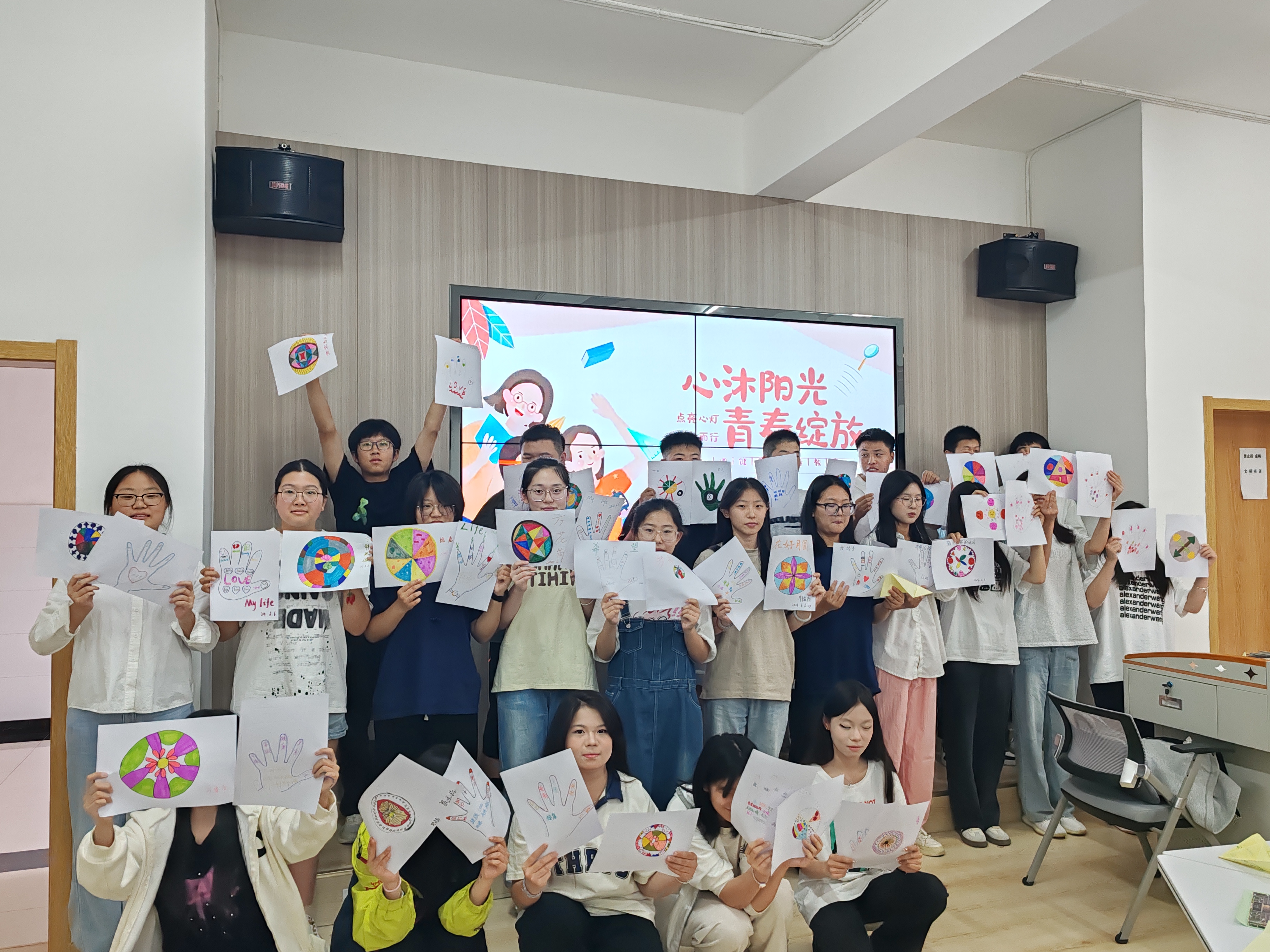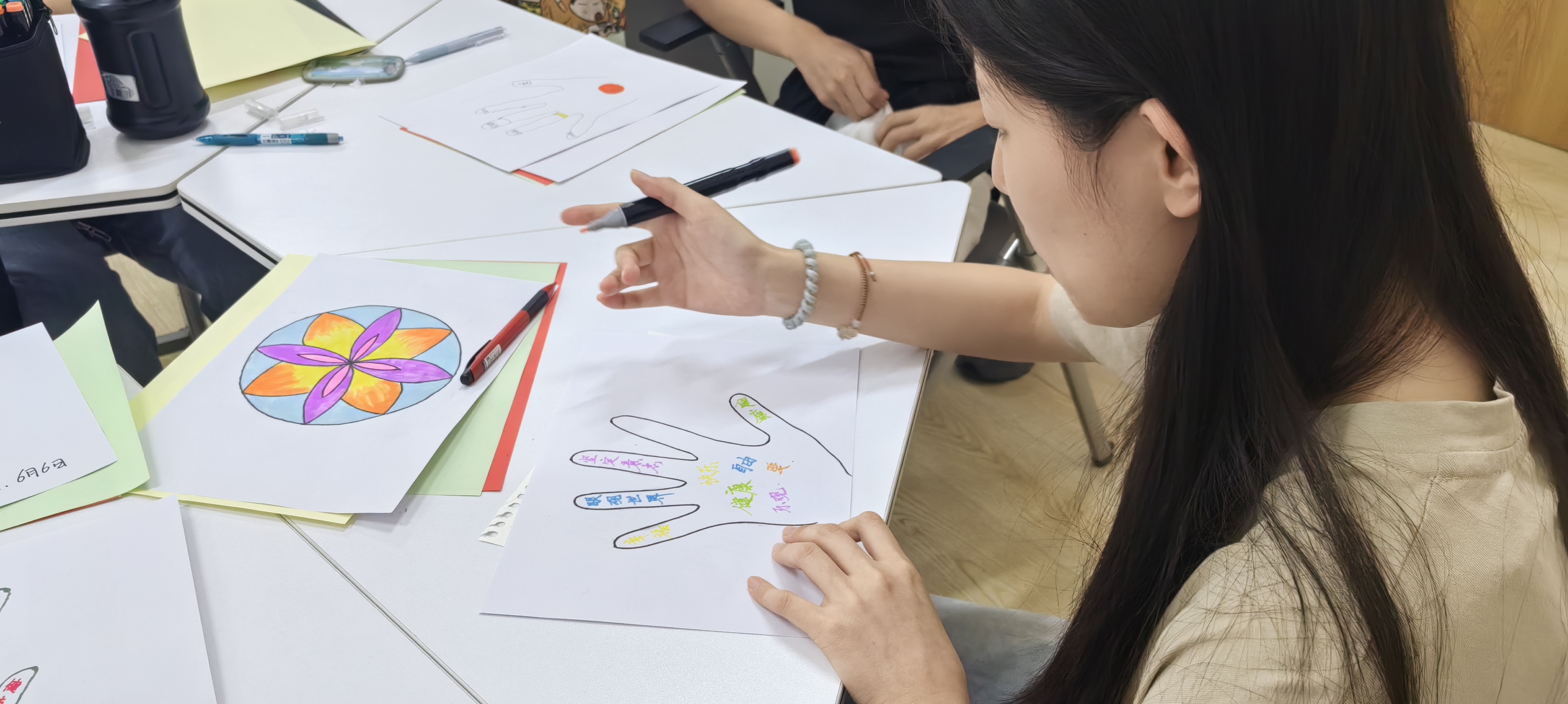 首先是多彩曼陀羅活動。同學們紛紛拿起畫筆,通過繪畫將潛意識內壓抑的感情與沖突呈現出來。通過多彩的繪畫作品來調整情緒,同時在和老師、同學的分享中獲得了滿足感、成就感和自信心。