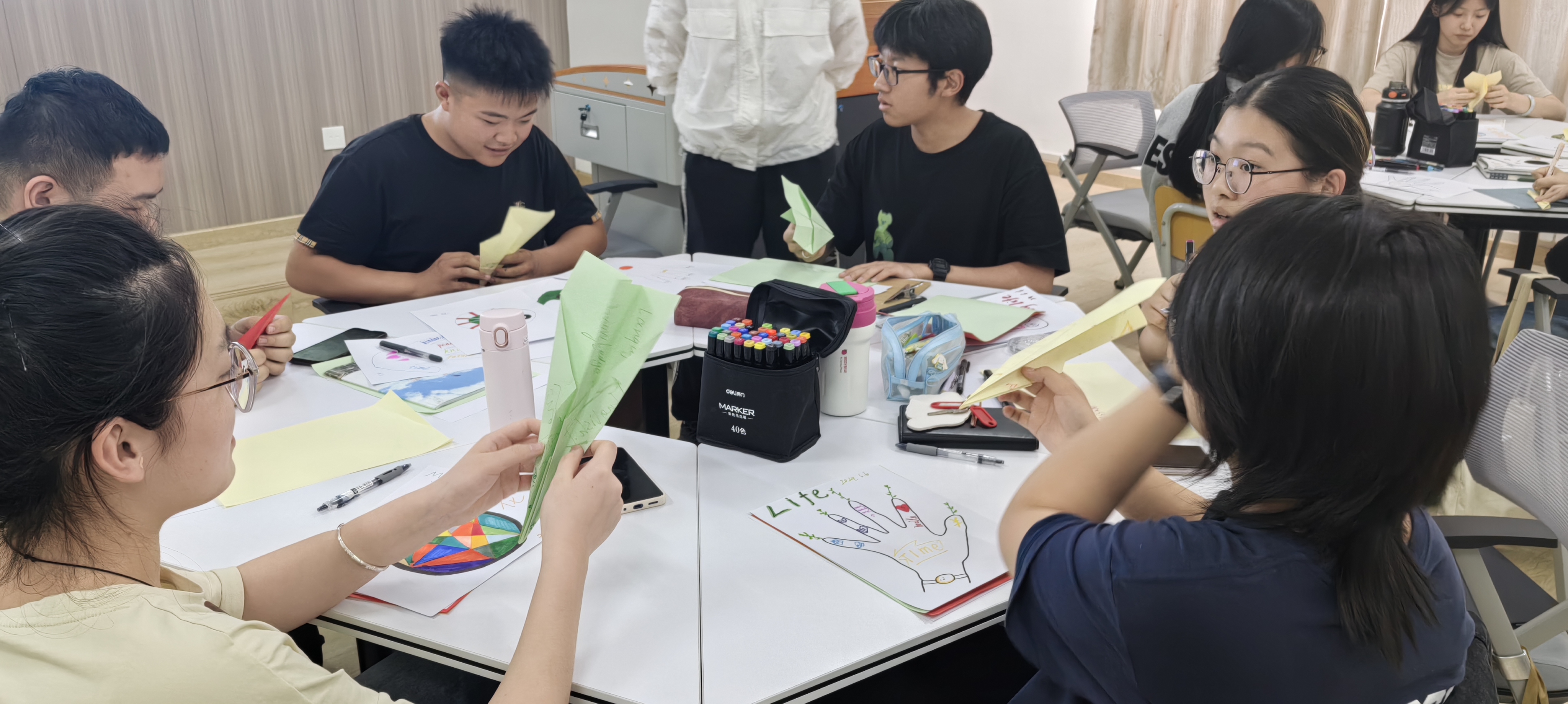 最后是煩惱紙飛機活動。同學們將煩惱寫在彩紙上并折成紙飛機。將承載著煩惱的文字化為紙飛機,讓這些煩惱隨著紙飛機飛向天空,紙飛機的飛行也象征著內心的解脫和成長。同學們爭先恐后地向天空拋出自己的煩惱,在全力擲出紙飛機后,積壓已久的情緒得到了釋放,臉上緩緩流露出舒展的笑顏。
